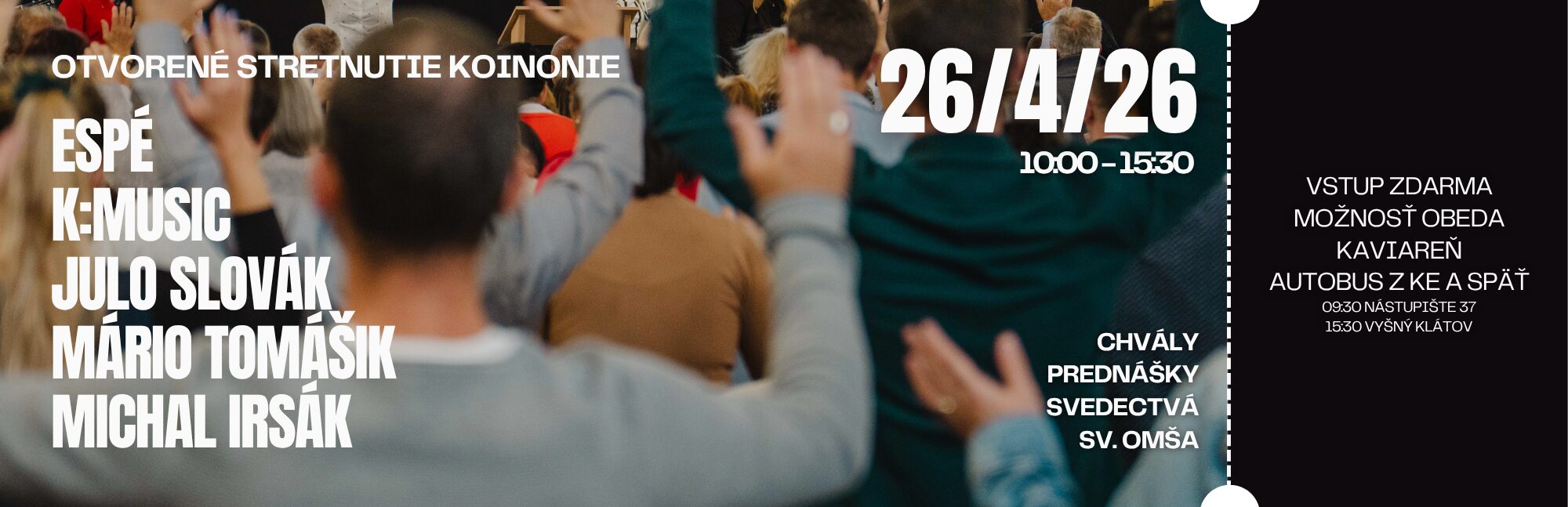 Majte všetky informácie na Telegrame! Pridajte sa do nášho informačného kanála v aplikácii Telegram a dostávajte aktuálne informácie priamo do mobilu. Pridať sa Ježiš sa nám dal poznať, keď... Prečítajte si viac Koinonia Ján Krstiteľ Je ľud na ceste, ktorý spoločne ohlasuje živého Krista. Naše aktivity Čo Robíme? Pozrite si kompletný prehľad toho čo Koinonia vo Vyšnom Klátove ponúka: Čo robíme Novinky nájdete na našich sieťach Facebook Instagram YouTube Prosba o modlitbu Tvoje meno Tvoj email Tvoja správa Δ